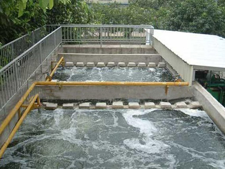 工藝流程:酸洗廢水→格柵→廢水調(diào)節(jié)池→混凝反應(yīng)池→斜管沉淀池→PH調(diào)整池 →生物濾池 → 砂濾池 →達(dá)標(biāo)排放 。 二、酸洗廢水處理工程工藝流程簡要說明: 五金前處理車間產(chǎn)生的酸洗清洗廢水先進(jìn)入調(diào)節(jié)池。進(jìn)入調(diào)節(jié)池前先由格柵將廢水中的較大顆粒雜物攔截。被攔截在格柵表面的雜物由人工清理。廢水在調(diào)節(jié)池進(jìn)行均質(zhì)。用泵將調(diào)節(jié)池內(nèi)的廢水定量抽至混凝反應(yīng)池,開啟加藥系統(tǒng)往廢水中投加堿液,調(diào)廢水的PH值在10以上,并開啟壓縮空氣攪拌,利用廢水中含有的大量的Fe3+對(duì)廢水中的污染物進(jìn)行混凝,攪拌反應(yīng)約10分鐘后,打開加藥泵自動(dòng)投加絮凝劑Ca(OH)2、PAM溶液進(jìn)行絮凝。繼續(xù)攪拌反應(yīng)約30分鐘后,出水自流至斜管沉淀池進(jìn)行固液分離。斜管沉淀池的出水自流至PH調(diào)整池,通過PH自動(dòng)加藥泵投加H2SO4調(diào)PH值為6~9,調(diào)PH值完畢后,廢水進(jìn)入生物濾池,利用生物填料表面形成的生物膜具有吸附作用和生化降解作用的兩種功能,將廢水中剩余的有機(jī)污染物進(jìn)行吸附、過濾、氧化分解,廢水在生物濾池內(nèi)有效停留時(shí)間為1.5小時(shí)。生物濾池內(nèi)裝有反沖洗裝置, 可視過濾情況采用氣水混合進(jìn)行反沖洗,沖洗水流回廢水調(diào)節(jié)池。生物濾池的水自流入砂濾池,砂濾池里裝有過濾石起到吸附過濾的作用.出水自流入清水池收集.清水池的出水自流至排放槽進(jìn)行達(dá)標(biāo)排放。 三、酸洗廢水處理達(dá)標(biāo)要求: 設(shè)計(jì)處理后水質(zhì)達(dá)廣東省地方標(biāo)準(zhǔn)《水污染物排放限值》(DB44/26-2001)一級(jí)標(biāo)準(zhǔn),即: 四、五金前處理酸洗廢水處理工程案例
