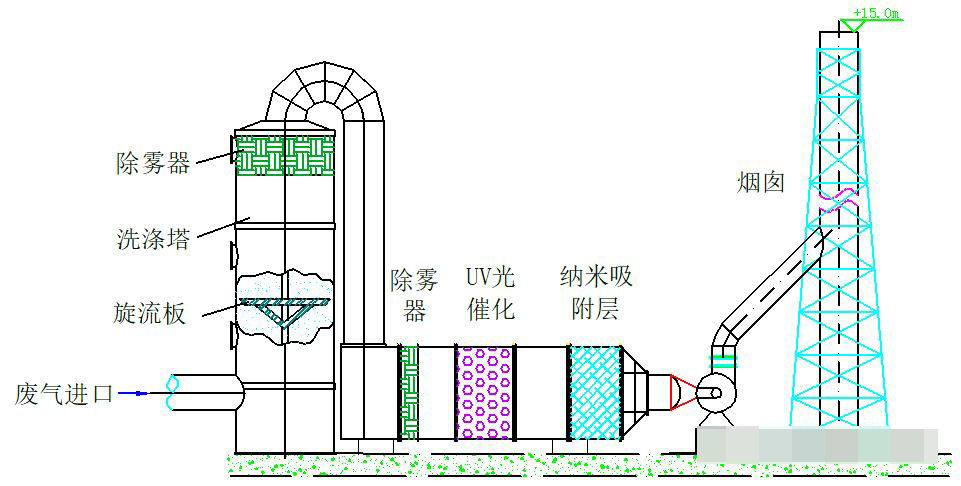 ①難降解的有機(jī)物經(jīng)過廢氣凈化除臭設(shè)備進(jìn)行處理后的尾氣達(dá)到排放標(biāo)準(zhǔn),其中凈化設(shè)備包括一級(jí)噴淋洗滌塔+除濕裝置+高能紫外燈光催化氧化裝置+活性炭吸附裝置。