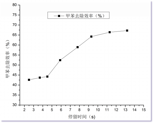 2、當(dāng)停留時(shí)間達(dá)到11s后,延長(zhǎng)停留時(shí)間,甲苯的降解效率增加不明顯。尤其是在低濃度下,延長(zhǎng)停留時(shí)間并不能有效的增加甲苯去除效率。