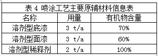 該機械企業(yè)原本使用溶劑型涂料進行噴涂作業(yè)(具體參見表4),在噴漆+晾干過程會產(chǎn)生有機廢氣,主要成分為:漆霧顆粒物、甲苯、二甲苯、醋酸乙酯、醋酸丁酯、環(huán)已酮及其他有機廢氣。按照《江蘇省重點行業(yè)揮發(fā)性有機物排放量計算暫行辦法》估算,揮發(fā)性有機物產(chǎn)生量為:底漆3噸*70%+面漆3噸*60%+稀釋劑2噸=5.9噸。