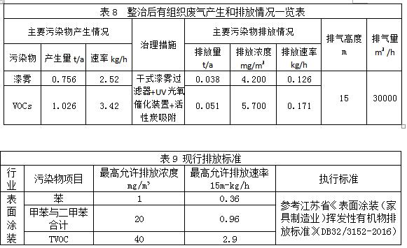 采用干式漆霧過濾器+UV光氧催化+活性炭吸附聯(lián)合處理工藝,對噴涂廢氣進行處理,處理效率達95%以上。噴漆過程產(chǎn)生的漆霧和揮發(fā)性有機物經(jīng)抽風(fēng)系統(tǒng)送入干式漆霧過濾器除去大部分漆霧和顆粒物,剩余氣體進入UV光催化氧化設(shè)備,運用高能UV紫外線光束及臭氧對有機氣體進行協(xié)同分解氧化反應(yīng),使其降解化成低分子化合物,剩余未來得及反應(yīng)的廢氣及臭氧同時進入活性炭設(shè)備,活性炭起到緩沖作用,經(jīng)活性炭充分吸附凈化后經(jīng)15m高排氣筒達標(biāo)排放。詳細數(shù)據(jù)參見下列表格。