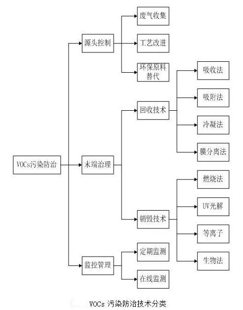 目前,廢氣治理行業(yè)公認(rèn)的處理技術(shù)可分為回收技術(shù)和銷毀技術(shù),整體的VOCs污染防治技術(shù)具體細(xì)分見下圖