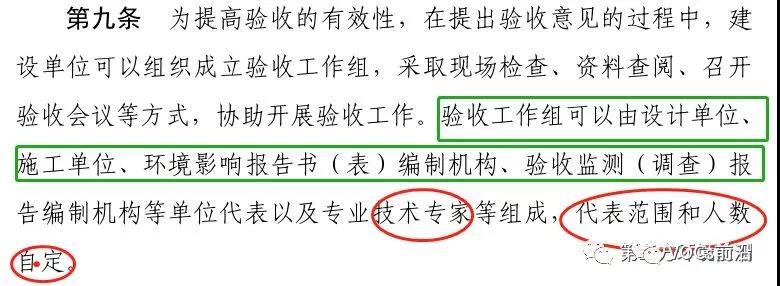 3.驗收工作組可以由設(shè)計單位、施工單位、環(huán)境影響報告書(表)編制機構(gòu)、驗收監(jiān)測(調(diào)查)報告編制機構(gòu)等單位代表以及專業(yè)技術(shù)專家等組成,代表范圍和人數(shù)建設(shè)單位自定。