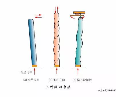 (c)為扭曲振動(dòng),它利用機(jī)械傳動(dòng)裝置定期將濾袋扭轉(zhuǎn)一定角度,使塵粒脫落。