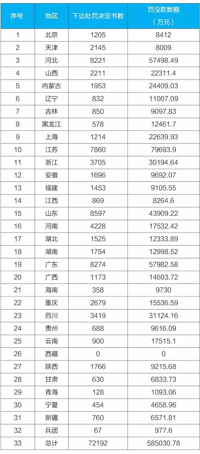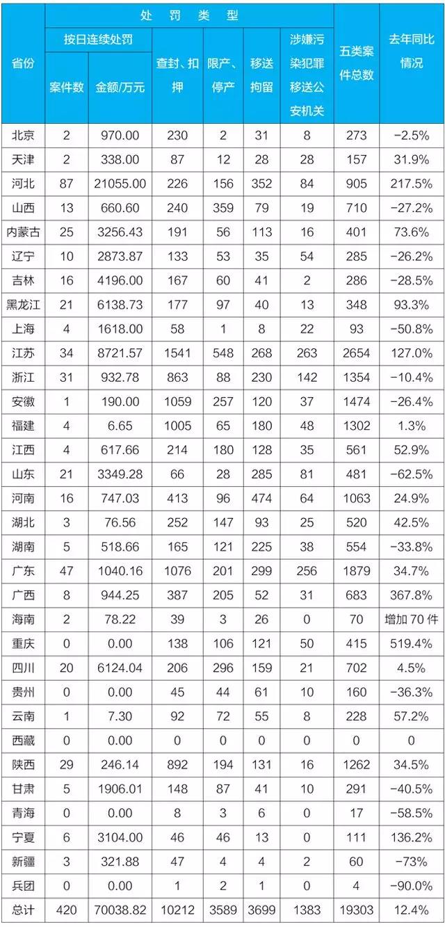 生態(tài)環(huán)境部今日向媒體通報(bào)各地2018年上半年環(huán)境行政處罰案件與《環(huán)境保護(hù)法》配套辦法的執(zhí)行情況。并對(duì)相關(guān)省、市、縣進(jìn)行表?yè)P(yáng)。 1-6月,全國(guó)環(huán)境行政處罰案件共下達(dá)處罰決定書(shū)72192份,罰沒(méi)款金額為585030.78萬(wàn)元。環(huán)境行政處罰力度較大的省份有江蘇、廣東、河北、山東四省。 1-6月,行政處罰案件數(shù)量排名前十的地市為:石家莊市、廣州市、深圳市、蘇州市、濰坊市、邯鄲市、東莞市、佛山市、成都市、臨沂市;1-6月行政處罰金額排名前十的地市為:深圳市、蘇州市、昆明市、徐州市、無(wú)錫市、廣州市、南通市、呼和浩特市、佛山市、泰州市。 1-6月,行政處罰案件數(shù)量排名前十的縣(區(qū))為:濰坊壽光市、廣州市白云區(qū)、佛山市順德區(qū)、煙臺(tái)萊州市、石家莊晉州市、深圳市寶安區(qū)、石家莊市藁城區(qū)、蘇州市吳江區(qū)、邯鄲市永年區(qū)、淄博市張店區(qū)。1-6月行政處罰金額排名前十的縣(區(qū))為:昆明市官渡區(qū)、深圳市寶安區(qū)、呼和浩特市新城區(qū)、上海市奉賢區(qū)、佛山市順德區(qū)、上海市寶山區(qū)、上海市崇明區(qū)、北京豐臺(tái)區(qū)、昆明市晉寧縣、哈爾濱市賓縣。 全國(guó)實(shí)施五類(lèi)案件總數(shù)為19303件,比去年同期(17169)增長(zhǎng)12.4%。按日連續(xù)處罰案件420件,比去年同期(503)減少16.5%,罰款金額達(dá)70038.82萬(wàn)元,比去年同期(61060.43萬(wàn)元)增長(zhǎng)14.7%;查封、扣押案件10212件,比去年同期(7553件)增長(zhǎng)35.2%;限產(chǎn)、停產(chǎn)案件3589件,比去年同期(3880)減少7.5%;移送行政拘留3699起,比去年同期(3939)減少6.1%;移送涉嫌環(huán)境污染犯罪案件1383件,比去年同期(1294)增長(zhǎng)6.9%。 配套辦法案件數(shù)量較多的江蘇、廣東、安徽、浙江、福建、陜西、河南七省,案件數(shù)量上升明顯的重慶、廣西、河北、寧夏、海南五省。 1-6月,配套辦法案件數(shù)量排名前十的地市為:徐州市、臺(tái)州市、廣州市、無(wú)錫市、呂梁市、蘇州市、泰州市、泉州市、西安市、深圳市。 截至6月底,全國(guó)所有地市均有適用《環(huán)境保護(hù)法》配套辦法查處的案件。 1-6月,配套辦法案件數(shù)量排名前十的縣(區(qū))為:廣州白云區(qū)、呂梁市交城縣、深圳市龍華新區(qū)、西安市鄠邑區(qū)、徐州市新沂市、常州市武進(jìn)區(qū)、合肥市廬陽(yáng)區(qū)、福建晉江市、徐州市豐縣、阜陽(yáng)市臨泉縣。 截至6月底,全國(guó)共有484個(gè)縣(區(qū))沒(méi)有適用《環(huán)境保護(hù)法》配套辦法案件。