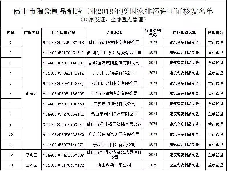 陶瓷制品制造工業(yè)2018年排污許可證發(fā)放范圍為年產(chǎn)衛(wèi)生陶瓷150萬件及以上、年產(chǎn)日用陶瓷250萬件及以上的陶瓷制品制造工業(yè),全部納入重點管理。 本次發(fā)證范圍名單如下: