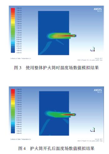 數(shù)值模擬結(jié)果顯示,使用整體護(hù)火筒時(shí),因筒內(nèi)局部溫度偏高,會(huì)造成護(hù)火筒選材困難;在護(hù)火筒頂部80°范圍內(nèi)開(kāi)設(shè)一定數(shù)量規(guī)格的圓孔有助于高溫火焰擴(kuò)散,降低筒內(nèi)局部溫度,既可以阻隔火焰的直接熱輻射,同時(shí)護(hù)火筒的選材使用310不銹鋼即可滿足要求。2種結(jié)構(gòu)護(hù)火筒的數(shù)值模擬結(jié)果見(jiàn)圖3、圖4。
