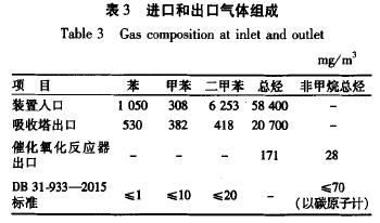 1.3 揮發(fā)性有機(jī)液體儲(chǔ)罐VOCs廢氣治理 揮發(fā)性有機(jī)液體儲(chǔ)罐應(yīng)優(yōu)先采用浮頂罐或壓力儲(chǔ)罐控制VOCs排放。但酸性水罐、污油罐等排放廢氣中含有較高濃度的油氣(VOCs),硫化氫、有機(jī)硫化物等,惡臭氣味嚴(yán)重,宜采用低溫柴油吸收+堿洗+催化氧化或蓄熱氧化技術(shù)處理;苯、甲苯、二甲苯浮頂罐區(qū)排放氣需要治理,宜采用活性炭吸附或預(yù)處理一催化氧化工藝。 1.3.1 罐區(qū)合硫油氣低溫柴油吸收+催化氧化裝置 國(guó)內(nèi)建有幾十套“低溫柴油吸收一堿液脫硫”裝置(以下簡(jiǎn)稱低溫柴油吸收)用于酸性水罐、污油罐等含硫油氣,其中,柴油吸收油氣、有機(jī)硫化物和大部分硫化氫,氫氧化鈉溶液吸收殘余的硫化氫,廢氣經(jīng)過處理,NMHC的質(zhì)量濃度小于25000 mg/m3,有機(jī)硫化物去除率接近100%,硫化氫去除率達(dá)99%以上,符合GB 14554--1993《惡臭污染物排放標(biāo)準(zhǔn)》和GB20950--2007(儲(chǔ)油庫大氣污染物排放標(biāo)準(zhǔn)》,但達(dá)不到《石油煉制工業(yè)污染物排放標(biāo)準(zhǔn)》以及天津市、北京市標(biāo)準(zhǔn)要求。為此,中國(guó)石油化工股份有限公司撫順石油化工研究院開發(fā)了如下工藝:①罐區(qū)廢氣低溫柴油吸收一活性炭吸附工藝,VOCs去除率達(dá)98%以上;②罐區(qū)廢氣低溫柴油吸收.催化氧化(或蓄熱氧化)工藝,按所在地要求,NMHC的質(zhì)量濃度小于80或20mg/In3;③罐區(qū)廢氣低溫柴油吸收-焚燒工藝,NMHC的質(zhì)量濃度小于20mg/m3。2015年,在青島某企業(yè)完成了VOCs廢氣低溫柴油吸收裝置尾氣進(jìn)加氫裝置加熱爐、克勞斯尾氣焚燒爐、CO余熱鍋爐、氨氣焚燒爐焚燒處理工業(yè)試驗(yàn),凈化氣NMHC的質(zhì)量濃度小于20mg/m3。 中國(guó)石化在上海市某煉化企業(yè)儲(chǔ)運(yùn)罐區(qū)油漿、對(duì)二甲苯、渣油、瀝青、重污油、輕污油等共24個(gè)中間油品儲(chǔ)罐和4個(gè)污水池VOCs廢氣采用“低溫柴油吸收.堿液脫硫+總烴濃度均化-催化氧化”裝置(簡(jiǎn)稱低溫柴油吸收+催化氧化裝置)處理,催化氧化單元廢氣處理量5 dam3/h,催化氧化反應(yīng)器入口溫度約350℃,裝置入口、低溫柴油吸收塔出口、催化氧化反應(yīng)器出口氣體組成見表3,凈化氣中苯、甲苯、二甲苯濃度小于檢出限,NMHC的質(zhì)量濃度小于30 mg/m3,遠(yuǎn)優(yōu)于上海市DB 3 1-933--2015(大氣污染物綜合排放標(biāo)準(zhǔn)》。
