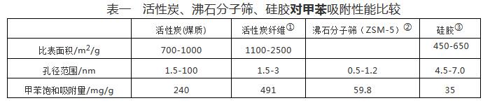 從表一可以看出,活性炭對甲苯的吸附容量遠遠高于沸石分子篩?;钚蕴坷w維則顯示出更高的吸附容量。