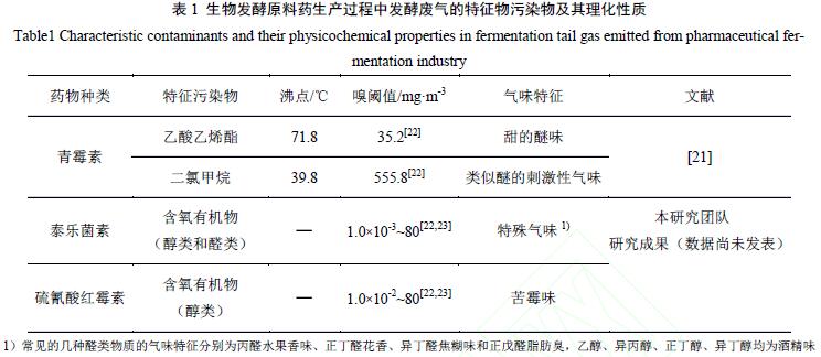 1.2 提取階段VOCs和異味的污染特征 提取指的是發(fā)酵液的預(yù)處理、固液分離,以及后續(xù)的產(chǎn)品精制純化等過程。提取廢氣的少部分來自于裝置排放的有組織工藝廢氣,可能是連續(xù)的,也可能是間歇的;大部分來自于非密閉式工藝過程中的無組織、間歇式的排放,這部分廢氣通過蒸發(fā)、吹掃和噴濺等方式逸散到大氣中。提取廢氣是制藥企業(yè)主要的VOCs 污染源,具有物質(zhì)濃度高、收集難度大等特征。 據(jù)報(bào)道,青霉素結(jié)晶工序、干燥工序和結(jié)晶車間可監(jiān)測到至少62種VOCs,其中結(jié)晶工序產(chǎn)生的污染物種類最多(55 種),TVOCs濃度范圍為29.6~446.7 mg•m-3,干燥工序和結(jié)晶車間排氣口處TVOC濃度相對較低,分別為8.5~14.3mg•m-3 和3.0~11.6mg•m-3。乙酸丁酯、正丁醇和丙酮作為青霉素提取階段的原料,在各工序排放尾氣中均能檢測到,且各監(jiān)測點(diǎn)污染物濃度波動(dòng)范圍較大,種類復(fù)雜,這是由于所有的化學(xué)反應(yīng)不可能完全進(jìn)行。此外,VOCs在氣相降解過程中與•OH、SO2、氮氧化物等均會發(fā)生反應(yīng),進(jìn)而產(chǎn)生二次污染物。Jenkin 等提出的MCM(master chemical mechanism)模型表明,乙酸丁酯和正丁醇在氣相降解過程中涉及100多種物質(zhì),這也進(jìn)一步解釋了青霉素提取過程中VOCs和異味物質(zhì)種類繁多的原因。 乙酸丁酯、正丙醇和丙酮等有機(jī)溶劑是青霉素、紅霉素和四環(huán)素等抗生素提取過程常用的溶媒,通過調(diào)研分析,這些藥企周邊環(huán)境空氣檢出率最高、檢出濃度最大的污染物基本上是提取階段使用的酯類、醇類和酮類等有機(jī)溶劑。雖然這些含氧有機(jī)物的嗅閾值與硫化物、醛類和有機(jī)酸類物質(zhì)相比較高,但當(dāng)濃度較高時(shí)仍對人體有較大刺激性。例如,乙酸丁酯為水果香味、嗅閾值為0.076mg•m-3,正丙醇為酒精味、嗅閾值為0.23 mg•m-3,丙酮為辛辣甜味、嗅閾值為99.8mg•m-3,而醛類和有機(jī)酸類的嗅閾值一般在0.05mg•m-3 以下。表2 總結(jié)了青霉素、泰樂菌素、硫氰酸紅霉素、維生素C 和維生素B12提取廢氣的特征污染物及其理化性質(zhì)。