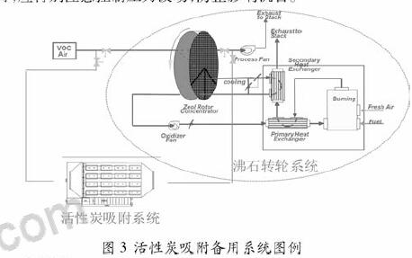 沸石轉(zhuǎn)輪系統(tǒng)每年均需進行幾次例行保養(yǎng),保養(yǎng)過程中系統(tǒng)處于停機狀態(tài),不能處理VOC廢氣。為保證在沸石轉(zhuǎn)輪系統(tǒng)停機保養(yǎng)或故障停機期間,VOC 廢氣能被有效處理,應(yīng)當(dāng)設(shè)置備用處理系統(tǒng)。備用處理系統(tǒng)可選用另一套沸石轉(zhuǎn)輪系統(tǒng),也可選用活性炭吸附備用系統(tǒng)?;钚蕴课较到y(tǒng)與沸石轉(zhuǎn)輪系統(tǒng)比較,優(yōu)點是安裝運行成本低,缺點是會產(chǎn)生固體廢物廢活性炭,且活性炭使用周期短。主系統(tǒng)與備用系統(tǒng)之間切換時,應(yīng)特別注意控制壓力波動,防止影響機臺。