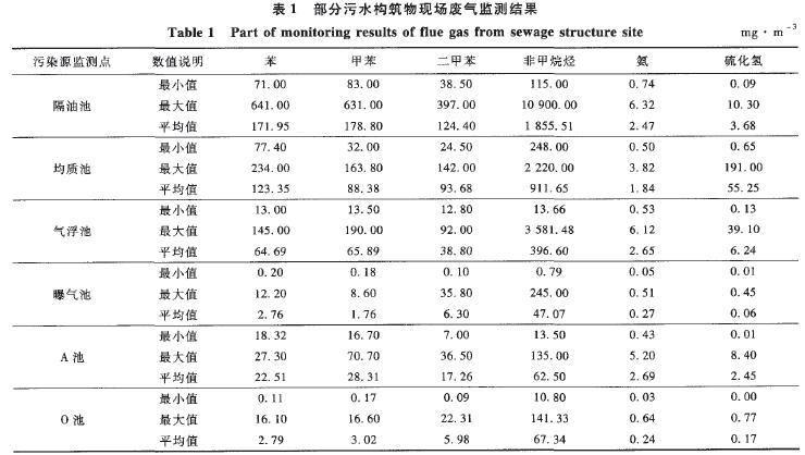 隨著我國(guó)工業(yè)化進(jìn)程的不斷加快,污水處理事業(yè)得到了迅速有效的發(fā)展,目前及今后一個(gè)時(shí)期,我國(guó)污水處理廠的數(shù)量將持續(xù)增加。而惡臭廢氣的產(chǎn)生貫穿于污水處理的全過(guò)程,尤其是在煉油污水處理過(guò)程中,因各污水處理池體處于露天敞口狀態(tài),如隔油池、均質(zhì)池、調(diào)節(jié)池、沉砂池、中和池、氣浮池、曝氣池、A/O池,以及污泥系統(tǒng)的構(gòu)筑物等,在運(yùn)行過(guò)程中均會(huì)逸散大量的惡臭氣體,這些廢氣主要由H S、NH 、有機(jī)硫化物、酚類及VOC氣體等有害氣體組成,對(duì)空氣環(huán)境造成一定影響,對(duì)現(xiàn)場(chǎng)操作人員的健康造成危害。這些污染氣體擴(kuò)散至周邊區(qū)域,當(dāng)操作人員在高濃度氣體逸散構(gòu)筑物區(qū)域長(zhǎng)時(shí)間停留時(shí),會(huì)有惡心、刺鼻、辣眼等不良反應(yīng)? 。酸性、腐蝕性廢氣還會(huì)對(duì)周圍環(huán)境中的設(shè)備、管線產(chǎn)生腐蝕,縮短了設(shè)備的使用壽命與維修周期,給安全生產(chǎn)帶來(lái)了極大的隱患。 根據(jù)2015年7月1日發(fā)布的《石油煉制工業(yè)污染物排放標(biāo)準(zhǔn)》(GB 31570.2015) 和2015年3月1日發(fā)布的《石油煉制工業(yè)廢水治理工程技術(shù)規(guī)范》(HJ 2045—2014) 以及《惡臭污染物排放標(biāo)準(zhǔn)》(GB14554—1993) ,同時(shí)根據(jù)各地方相繼出臺(tái)的一系列大氣排放標(biāo)準(zhǔn)與規(guī)定,向大氣排放惡臭氣體的排污單位,必須采取措施防止周圍居民區(qū)受到污染。環(huán)保形勢(shì)日益嚴(yán)峻,惡臭氣體處理迫在眉睫,因此,對(duì)污水處理廠惡臭廢氣的治理勢(shì)在必行。 目前,吸附冷凝工藝主要應(yīng)用于高濃度油氣回收領(lǐng)域 ,可大大減少污染氣體中的總烴濃度,而由生物滴濾與生物過(guò)濾組合的生物氧化工藝則主要用于處理低濃度有機(jī)氣體 ;但對(duì)于煉油污水處理裝置來(lái)說(shuō),既有由污水預(yù)處理單元的污水總?cè)肟?、格柵、沉砂池、隔油池、中和池、均質(zhì)調(diào)節(jié)池、氣浮池和污泥處理單元等環(huán)節(jié)逸散的中高濃度惡臭氣體,也有由曝氣池、厭氧/好氧池、氣浮池等生化水處理裝置逸散的低濃度惡臭氣體。 為此,本文主要討論采用高低濃度分段處理的方法去除污染物氣體,針對(duì)高濃度混合廢氣,采用多孑L性固體填料吸附原理,脫出高濃度混合廢氣中的硫化物、非甲烷總烴及其他污染物,使其轉(zhuǎn)化為污染物濃度相對(duì)較低的廢氣,再與廢氣收集系統(tǒng)的低濃度廢氣混合,進(jìn)入由生物滴濾與生物過(guò)濾組合的生物氧化處理單元,通過(guò)生物氧化處理將廢氣中污染物氧化分解成二氧化碳、水、無(wú)機(jī)鹽及礦物質(zhì)等脫出,使原料廢氣滿足《石油煉制工業(yè)污染物排放標(biāo)準(zhǔn)》(GB 31570-2015)和《惡臭污染物排放標(biāo)準(zhǔn)》(GB 14554-1993)排放標(biāo)準(zhǔn) 。 一、材料與方法 1.1原料規(guī)格 本裝置生產(chǎn)原料主要為煉油污水處理裝置中各類污水構(gòu)筑物的逸散廢氣,此廢氣主要成分有苯、甲苯、二甲苯、非甲烷總烴、硫化氫、氨氣等組分,具體污染物含量如表1所示。