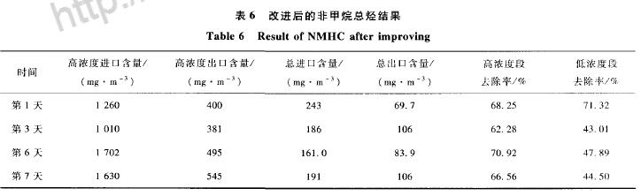 3.1.2 聯(lián)機(jī)調(diào)試階段結(jié)果分析 1)高濃度段硫化氫去除率均大于99.5% ,滿足要求。 2)高濃度段氨、苯、甲苯、非甲烷總烴的去除率逐步降低。 3)低濃度段各污染物去除率不穩(wěn)定。 4)總出口非甲烷總烴含量超過(guò)《石油煉制工業(yè)污染物排放標(biāo)準(zhǔn)》(GB 31570—20l5)和《惡臭污染物排放標(biāo)準(zhǔn)》(GB 14554.1993)中的排放限值要求。 3.1.3 聯(lián)機(jī)調(diào)試階段存在的問(wèn)題、原因分析及改進(jìn)方法 1)由高濃度段氨、苯、非甲烷總烴的去除率變化趨勢(shì)可知,吸附罐的吸附效率逐漸降低。經(jīng)分析,可能原因?yàn)椋喝丝跉怏w污染物含量超標(biāo)、吸附效果不好、解析效果不好。 改進(jìn)方法:針對(duì)吸附罐吸附效率低、解析效果不理想的問(wèn)題,逐步改變吸附時(shí)問(wèn)、解析時(shí)I1;IJ 反沖時(shí)間。將吸附時(shí)間縮短,同時(shí)將解析時(shí)間比例加長(zhǎng),后又改為1個(gè)吸附周期實(shí)現(xiàn)2次解析、2次反沖過(guò)程,增加脫附和反沖次數(shù),增強(qiáng)解析效果。2)生物滴濾段及生物過(guò)濾段的微生物馴化效果還不穩(wěn)定,其對(duì)苯及非甲烷總烴的去除效果不理想改進(jìn)方法:在馴化過(guò)程中逐步調(diào)整,在生物過(guò)濾段及滴濾段中添加苯降解菌及烴類降解菌,并定期定量投加營(yíng)養(yǎng)物質(zhì),人工調(diào)節(jié)pH,觀察污染物去除效果。 3)吸附劑解析氣體中水蒸氣較多,使二級(jí)、三級(jí)冷箱結(jié)霜嚴(yán)重,除霜不徹底時(shí),會(huì)影響解析效果改進(jìn)方法:將冷箱溫度適當(dāng)升高,在維持系統(tǒng)穩(wěn)定運(yùn)行、保證除霜效果的情況下,確保解析氣巾的組分得到冷凝。 3.2 改進(jìn)后的結(jié)果及分析 3.2.1 改進(jìn)后的結(jié)果 改進(jìn)后的結(jié)果如表6所示。