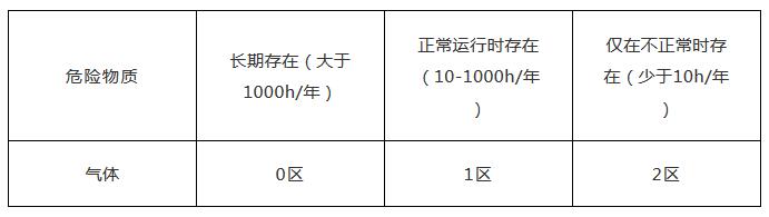 按場所中危險物質(zhì)存在時間的長短,將兩類不同物態(tài)下的危險場所劃分為三個區(qū),即:對爆炸性氣體環(huán)境,為 0 區(qū)、 1 區(qū)和 2 區(qū);對可燃性粉塵環(huán)境,為 20 區(qū)、 21 區(qū)和 22 區(qū)。