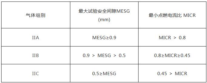 II 類隔爆型電氣設(shè)備或本質(zhì)安全型電氣設(shè)備,按其適用于爆炸性氣體混合物的最大試驗安全間隙或最小點燃電流比,進一步分為 IIA 、 IIB 和 IIC 類。如下表所示。