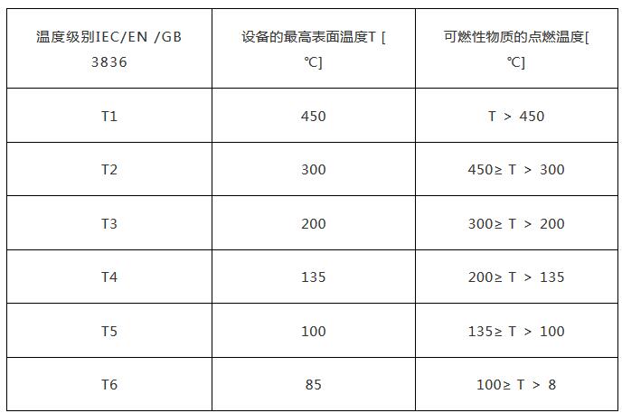 電氣設(shè)備按其最高表面溫度分為 T1~T6 組,使得對應(yīng)的 T1~T6 組的電氣設(shè)備的最高表面溫度不能超過對應(yīng)的溫度組別的允許值。溫度組別、設(shè)備表面溫度和可燃性氣體或蒸汽的引燃溫度之間的關(guān)系如下表所示: