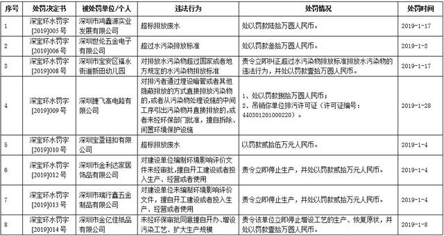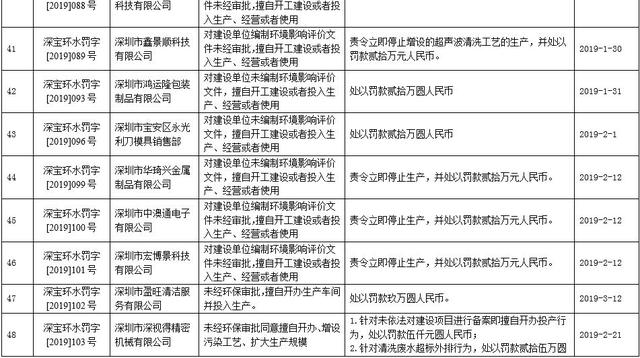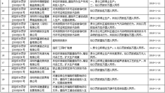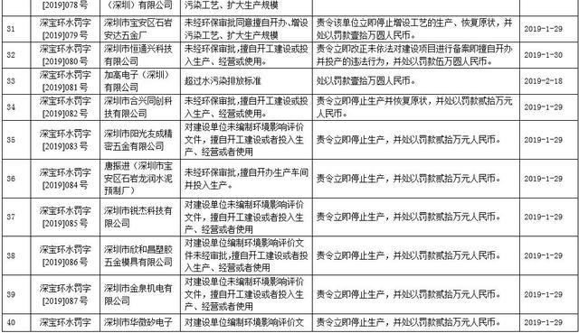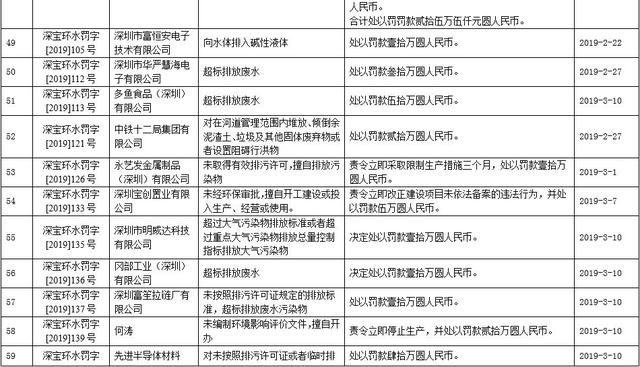 2019年第一季度,原深圳市寶安區(qū)環(huán)境保護和水務(wù)局共作出86宗環(huán)境行政處罰決定,處罰金額共計1228.457萬元,其中,處罰金額大于或等于5萬元人民幣的重大環(huán)境違法案例共有59宗。 現(xiàn)將寶安區(qū)2019年第一季度,59宗重大環(huán)境違法案件予以公開曝光,接受社會監(jiān)督,督促違法單位或個人守法經(jīng)營。 2019年第一季度重大環(huán)境違法案件曝光臺
