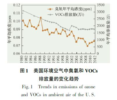 美國是最早發(fā)生光化學(xué)污染的國家。經(jīng)過幾十年的努力,美國已經(jīng)建立了科學(xué)的VOCs管控體系,其現(xiàn)行的環(huán)境空氣質(zhì)量管控體系主要包括環(huán)境空氣質(zhì)量標(biāo)準(zhǔn)( NAPPS) 、州實(shí)施計(jì)劃( SIPs) 制度、各種污染源控制標(biāo)準(zhǔn)( NEPS、NESHAPS 等) 、新源評(píng)估制度( NSP) 、運(yùn)營許可證制度( Operating Permits) 。這些制度和標(biāo)準(zhǔn)互為補(bǔ)充,構(gòu)成了有效的大氣污染控制體系。依托該管控體系,美國VOCs排放總量呈下降趨勢,從1980年的3204.4 萬t下降為2012年的1762.4萬t,下降了約45%。同時(shí),隨著VOCs排放量的減少,美國大氣環(huán)境中臭氧的含量明顯減少。如圖1 所示。