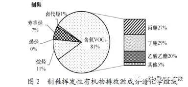 相關學者對珠三角地區(qū)制鞋行業(yè)揮發(fā)性有機物(VOCs)排放源成分譜的分析顯示,隨著近年來稀釋劑和清洗劑中的酯類和酮類等物質(zhì)逐步代替苯系物溶劑,制鞋有機廢氣中含氧揮發(fā)性有機物比例明顯增大,主要有乙酸乙酯、丙酮、異丙醇。