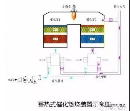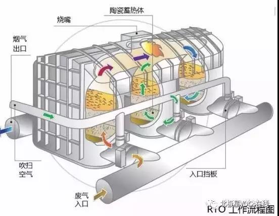 氧化產(chǎn)生的高溫氣體流經(jīng)特制的陶瓷蓄熱體,使陶瓷體升溫而“蓄熱”,此“蓄熱”用于預(yù)熱后續(xù)進(jìn)入的有機(jī)廢氣。從而節(jié)省廢氣升溫的燃料消耗。陶瓷蓄熱室應(yīng)分成兩個(gè)(含兩個(gè))以上,每個(gè)蓄熱室依次經(jīng)歷蓄熱-放熱-清掃等程序,周而復(fù)始,連續(xù)工作。蓄熱室“放熱”后應(yīng)立即引入適量潔凈空氣對(duì)該蓄熱室進(jìn)行清掃(以保證VOC去除率在98%以上),只有待清掃完成后才能進(jìn)入“蓄熱”程序。否則殘留的VOCS隨煙氣排放到煙囪從而降低處理效率。
