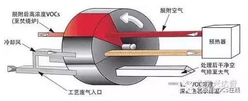 濃縮轉(zhuǎn)輪/焚燒爐系統(tǒng)吸附大風(fēng)量低濃度揮發(fā)性有機(jī)化合物(VOCs)。再把脫附后小風(fēng)量高濃度廢氣導(dǎo)入焚燒爐予以分解凈化。大風(fēng)量低濃度的VOCs廢氣,通過一個(gè)由沸石為吸附材料的轉(zhuǎn)輪,VOCs經(jīng)被轉(zhuǎn)輪吸附區(qū)的沸石所吸附后凈化的氣體經(jīng)煙囪排到大氣,再于脫附區(qū)中用180℃~200℃的小量熱空氣,將VOCs予以脫附。如此一高濃度小風(fēng)量的脫附廢氣在導(dǎo)入焚燒爐中予以分解為二氧化碳及水氣,凈化的氣體經(jīng)煙囪排到大氣。這一濃縮的工藝大大地降低燃料費(fèi)用。