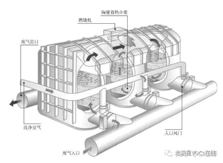 ①待處理有機(jī)廢氣進(jìn)入1號(hào)蓄熱室的陶瓷蓄熱體(該陶瓷蓄熱體儲(chǔ)存了上一循環(huán)的熱量),陶瓷蓄熱體放熱降溫,而有機(jī)廢氣吸熱升溫,廢氣離開蓄熱室后以較高的溫度進(jìn)入氧化室,此時(shí)廢氣溫度的高低取決于陶瓷體體積、廢氣流速和陶瓷體的幾何結(jié)構(gòu)。有機(jī)廢氣在氧化室中由燃燒器加熱升溫至設(shè)定的氧化溫度,使其中的VOCs成分分解成二氧化碳和水。由于廢氣已在蓄熱室內(nèi)預(yù)熱,燃料耗量大為減少。氧化室有兩個(gè)作用:一是保證廢氣能達(dá)到設(shè)定的氧化溫度;二是保證有足夠的停留時(shí)間使廢氣中的VOCs充分氧化。