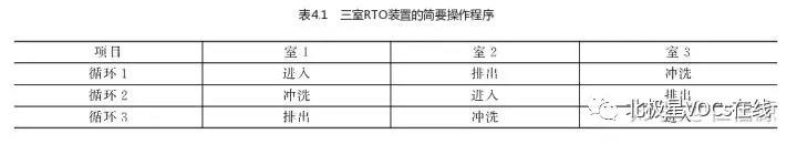 若對(duì)有機(jī)廢氣的凈化率要求很高,則可采用兩種方法:一種是延長(zhǎng)循環(huán)時(shí)間的操作方法,但這樣會(huì)使熱效率降低;另一種常用的方法是增加一臺(tái)沖洗用蓄熱室,即采用三室RTO裝置,下圖為三室RTO示意圖。