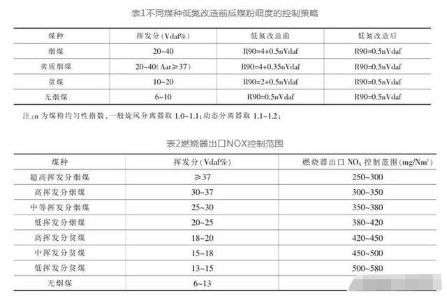 (Vdaf)含量高低影響。表3給出了煤質(zhì)揮發(fā)分對(duì)飛灰含碳量和機(jī)械不完全燃燒熱損失(q4)的一般影響范圍。 我們購(gòu)進(jìn)的煤質(zhì)大概情況是:揮發(fā)分Vdaf=30%~35%,灰分Aar=33.5%~37.5%;按照以上原則,確定低氮燃燒器的合理取值范圍及建議為: (1)煤粉細(xì)度R90≤18~19; (2)低氮燃燒器出口NOx控制范圍300mg/Nm3~350mg/Nm3; (3)由此產(chǎn)生的飛灰含碳量升高1%~1.5%; (4)改造并調(diào)整粗粉分離器,提高煤粉均勻性指數(shù),減少粗顆粒煤粉含量。