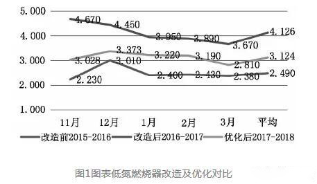 由圖1可以看出,經(jīng)過(guò)優(yōu)化調(diào)整,飛灰含碳量得到有效控制。低氮燃燒器改造前飛灰含碳量平均值2.49%,改造后飛灰含碳量平均值4.13%;優(yōu)化調(diào)整后飛灰含碳量平均值3.12%,較改造前飛灰含碳量平均值升高0.63%。比對(duì)表3,改造優(yōu)化后飛灰含碳量控制在較合理的范圍內(nèi)。 2.3、SNCR脫硝運(yùn)行情況 2.3.1、溫度場(chǎng)改變,反應(yīng)窗口后移 低氮燃燒器改造后,通常會(huì)導(dǎo)致?tīng)t膛出口排煙溫度上升,具體表現(xiàn)在過(guò)熱器容易超溫、噴水減溫水量增大等現(xiàn)象。應(yīng)重新校對(duì)鍋爐溫度場(chǎng),在滿足尿素?zé)峤獾暮线m位置增加噴槍,以提高該溫度區(qū)域尿素平面充滿度和爐膛穿透深度,減輕煙氣中氨濃度偏斜偏流情況。 具體方案為:在鍋爐標(biāo)高26140mm處的前墻增開5個(gè)孔,布置5個(gè)110°扇形噴槍。根據(jù)原SNCR噴槍廠家提供的資料、噴槍(流量范圍為60L/h~250L/h)模擬的速度場(chǎng)與溫度場(chǎng),新增5個(gè)噴槍與下層噴槍并聯(lián)布置。新增噴槍投運(yùn)后,SNCR總的噴氨量應(yīng)保持不變,并嚴(yán)格控制新增5個(gè)噴槍的壓縮空氣壓力和尿素溶液壓力,壓縮空氣壓力不應(yīng)超過(guò)0.3MPa,尿素溶液壓力不應(yīng)超過(guò)0.35MPa~0.45MPa,噴槍流量不應(yīng)超過(guò)250L/h,防止噴射距離過(guò)長(zhǎng)導(dǎo)致屏式過(guò)熱器腐蝕。 在運(yùn)行調(diào)試中,逐步調(diào)整5個(gè)新增噴槍的流量,新增每個(gè)噴槍流量從120L/h開始調(diào)整,并同步減少原6個(gè)噴槍的流量,以總噴尿素溶液量保持不變?yōu)樵瓌t。在新增5個(gè)噴槍投運(yùn)后,如果NOX濃度下降,可逐步增加5個(gè)噴槍的流量,繼續(xù)減少原6個(gè)噴槍的流量。在調(diào)整過(guò)程中,壓縮空氣壓力不應(yīng)超過(guò)0.3MPa,尿素溶液壓力不應(yīng)超過(guò)0.35MPa~0.45MPa,噴槍流量不應(yīng)超過(guò)250L/h。 在保持稀釋水量不變的情況下,減少原噴槍噴尿素溶液量,采用低濃度噴氨,提高氨在煙氣中分散度. 2.3.2、SCR的效率較低 導(dǎo)致SCR脫硝效率降低的原因如下: 1)低氮燃燒器投運(yùn)后,爐膛斷面煙氣溫度場(chǎng)發(fā)生較大變化,爐膛斷面NOX濃度分布有較大差異。而尿素噴槍設(shè)計(jì)按照均布方式設(shè)計(jì),使得局部區(qū)域氨過(guò)量,其它區(qū)域氨欠量。這種不均勻性一直延伸到SCR反應(yīng)區(qū),最終導(dǎo)致脫硝效率較低。 解決方法:優(yōu)化流場(chǎng),增加蒸汽擾動(dòng)器或氣流均布器,根據(jù)NOX分布合理調(diào)整各個(gè)噴嘴的尿素溶液供給量。 由于僅依靠墻式噴槍,很難達(dá)到還原劑與煙氣中的NOX均勻混合,因此在水平煙道出口的右側(cè)布置4個(gè)蒸汽擾動(dòng)孔,通過(guò)高速噴入的蒸汽對(duì)煙氣進(jìn)行擾動(dòng),或采用噴氨格柵,提高噴氨均勻性,促進(jìn)煙氣中NH3和NOX的混合。 在鍋爐水平煙道到垂直煙道段的轉(zhuǎn)折室,增設(shè)蒸汽擾動(dòng)裝置,以提高煙氣流暢的均勻性;根據(jù)NOX濃度斷面分布特性,合理調(diào)整各個(gè)噴槍的流量,以達(dá)到較小尿素耗量條件下較高的SNCR和SCR脫硝效率。 2)催化劑性能下降。 解決方法:更換催化劑。在采取其他措施后,如果氨耗量仍然高于理論氨耗量,或脫硝指標(biāo)達(dá)不到設(shè)計(jì)值,需采取更換催化劑的措施,以增加催化劑活性,并適當(dāng)增加催化劑體積,提高SCR段的脫硝效率。 2.3.3、脫硝系統(tǒng)分配計(jì)量裝置精度低 尿素溶液調(diào)節(jié)門設(shè)計(jì)過(guò)大,在小流量調(diào)節(jié)過(guò)程中精度低,使尿素溶液用量波動(dòng)大,NOX出口值波動(dòng)較大。解決方法:更換合適的調(diào)節(jié)門,使尿素溶液的流量處于調(diào)節(jié)門的主調(diào)節(jié)區(qū)范圍內(nèi),提高調(diào)節(jié)精度。 2.4、CEMS的NOX、氨逃逸等測(cè)量數(shù)據(jù)不準(zhǔn)確 2.4.1、NOX的測(cè)點(diǎn)后移 原有CEMS的測(cè)點(diǎn)布置在鍋爐出口的混合煙道上,該處氣流較為混亂,不滿足CEMS測(cè)點(diǎn)布置要求,將測(cè)點(diǎn)后移5m~6m,布置于分叉管道上;采用笛型管多點(diǎn)取樣,可提高測(cè)量準(zhǔn)確性。 2.4.2、氨逃逸的測(cè)點(diǎn)前移 由于受布置條件限制,原氨逃逸測(cè)點(diǎn)遠(yuǎn)離SCR裝置出口。又由于飛灰對(duì)NH3有較強(qiáng)的吸附作用,使得實(shí)際測(cè)得的氨逃逸數(shù)據(jù)失真,將氨逃逸測(cè)點(diǎn)上移至靠近SCR出口的附近。采用笛型管多點(diǎn)取樣,可提高測(cè)試準(zhǔn)確性。 2.4.3、進(jìn)行灰分中氨濃度的化驗(yàn),確保氨濃度≤50μg/g 根據(jù)已運(yùn)行脫硝項(xiàng)目的經(jīng)驗(yàn),氨逃逸量和飛灰中氨含量有一定對(duì)應(yīng)規(guī)律,因此可以通過(guò)定期檢測(cè)飛灰中氨濃度,間接判斷實(shí)際氨逃逸量。 3、效果 如圖2所示,2017年12月份完成改造前后對(duì)比,尿素噸負(fù)荷耗量呈下降趨勢(shì),且降低明顯。NOX排放日均值相對(duì)穩(wěn)定,且略有降低。
