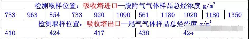 【吸收塔尾氣濃度較高】中石化環(huán)境監(jiān)測(cè)總站、中石化撫順石油研究院對(duì)華北地區(qū)采用貧油作為吸收劑噴淋的一套吸附法油氣回收裝置,進(jìn)行了吸收塔進(jìn)出口油氣濃度采樣檢測(cè)分析,得到如下數(shù)據(jù):