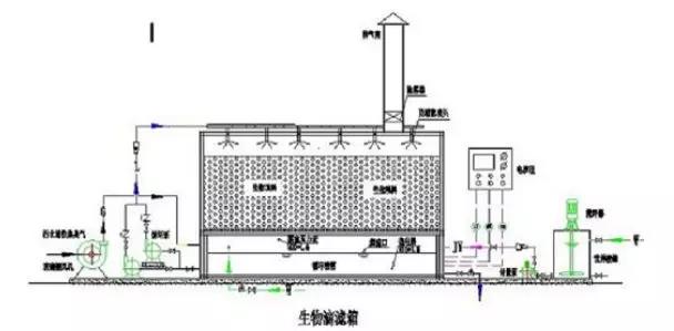 廢氣經(jīng)底部進(jìn)氣口進(jìn)入生物滴濾池,通過填料層與逆流而下的營養(yǎng)液充分接觸和傳質(zhì),在充足的停留時(shí)間內(nèi),氣相物質(zhì)經(jīng)平流效應(yīng)、擴(kuò)散效應(yīng)、吸附等綜合作用下通過氣膜并被吸附在潤濕的生物膜表面,吸附在生物膜表面的污染物成分被其中的微生物捕獲并吸收,經(jīng)生化反應(yīng)最終轉(zhuǎn)化成為無害的物質(zhì)。微生物代謝產(chǎn)物和老化的生物膜可被循環(huán)液及時(shí)轉(zhuǎn)移。