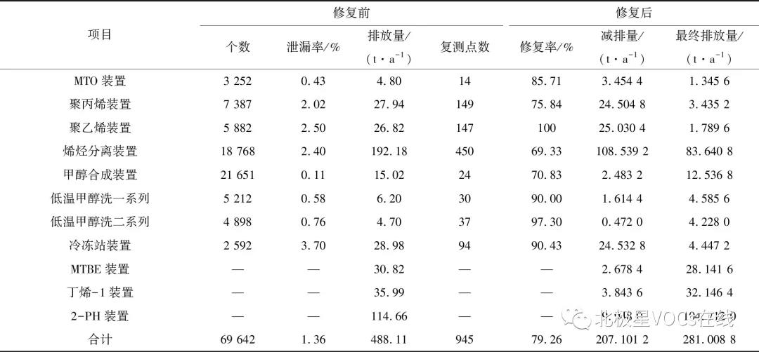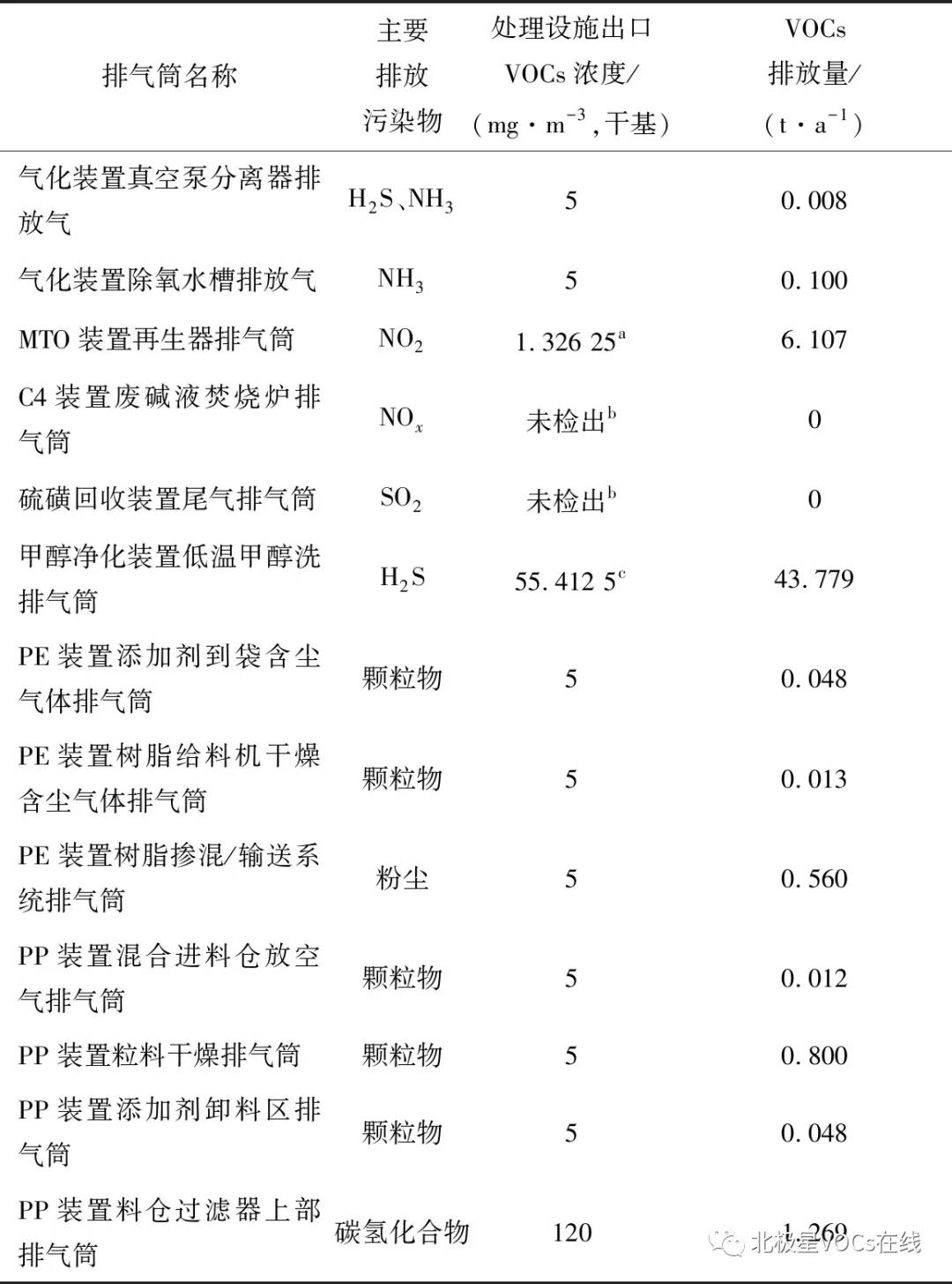 注:a表示該數(shù)據(jù)來(lái)源于第三方檢測(cè)的MTO裝置再生器排氣筒的非甲烷總烴濃度;b表示該數(shù)據(jù)從第三方檢測(cè)報(bào)告中現(xiàn)場(chǎng)實(shí)測(cè)數(shù)據(jù)選取;c表示該數(shù)據(jù)來(lái)源于第三方檢測(cè)報(bào)告中甲醇凈化裝置低溫甲醇洗排氣筒中甲醇濃度。
