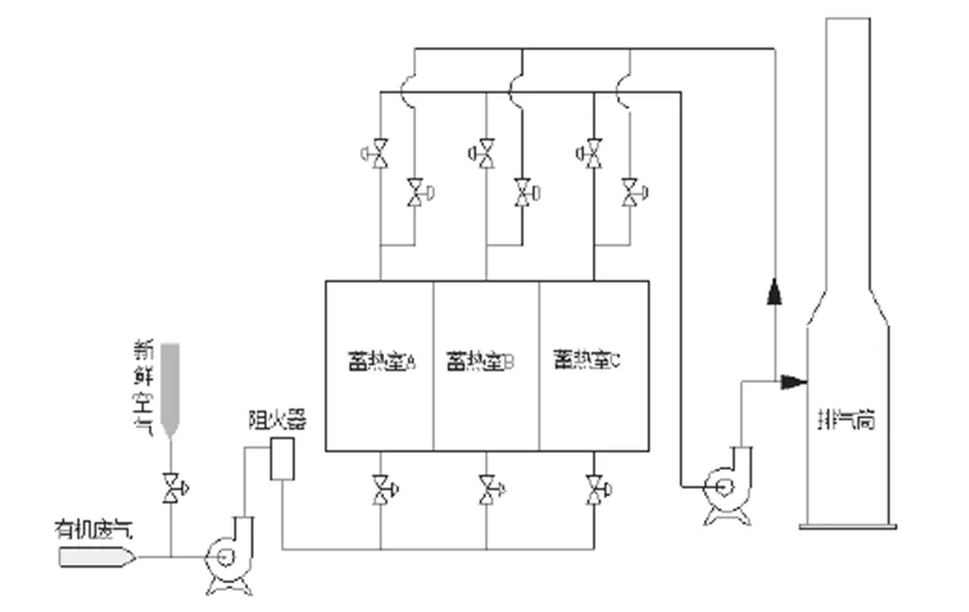 目前,在國內(nèi)應(yīng)用廣泛、工藝技術(shù)較為成熟的蓄熱式熱氧化爐(RTO)主要為三室RTO(RTO工藝流程圖見圖1),即RTO分為三個蓄熱室,其中蓄熱室填充床為耐熱、耐腐蝕的陶瓷材料填充,確保RTO熱回收率在95%以上,以便更好的凈化去除VOCs。其工作原理是使生產(chǎn)過程中產(chǎn)生的VOCs(濃度小于25 %LEL)在800℃以上發(fā)生氧化反應(yīng),使其氧化生成二氧化碳(CO2)和水(H2O);假如 VOCs中含有鹵素、硫等雜原子的有機(jī)物,則會氧化生成氯化氫(HCl)、二氧化硫(SO2)等氣體。首先廢氣通過管道經(jīng)RTO進(jìn)口閥進(jìn)入第1個蓄熱填充床發(fā)生氧化反應(yīng)燃燒分解,經(jīng)燃燒室充分燃燒后的高溫凈化氣體通過第3個蓄熱填充床被冷卻后,部分冷卻凈化氣體吹掃第2個蓄熱填充床,部分冷卻凈化氣體經(jīng)RTO引風(fēng)機(jī)進(jìn)入尾氣吸收系統(tǒng),噴淋吸收后達(dá)標(biāo)排放至大氣環(huán)境,三個蓄熱填充床依次經(jīng)歷加熱(氧化分解)、冷卻、吹掃等三個步驟,通過RTO進(jìn)口閥、出口閥、吹掃閥自動切換,周而復(fù)始,循環(huán)操作。