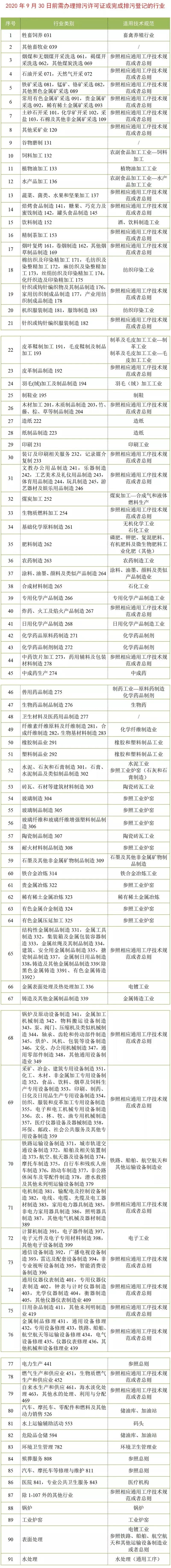 另外一個(gè)申領(lǐng)時(shí)限是,2020年9月30日前要求完成所有固定污染源發(fā)證登記工作。即指納入2019年版名錄的現(xiàn)有排污單位(名錄明細(xì)見(jiàn)下圖),應(yīng)于2020年9月30日前申請(qǐng)并取得排污許可證,或完成排污登記。