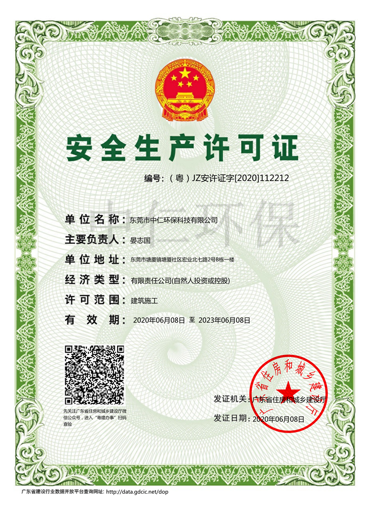 東莞市中仁環(huán)??萍加邢薰精@得廣東省安全生產(chǎn)許可證書。