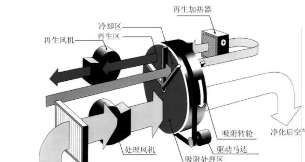 VOC是含有機(jī)揮發(fā)物的廢氣,VOC吸入蜂窩狀轉(zhuǎn)輪后,被轉(zhuǎn)輪上的沸石吸附,從空氣中分離出來。在解吸附區(qū)域,所吸附的VOC用一路很小的熱空氣(約180至250℃)吹掃,從沸石上脫附下來,此時(shí)VOC濃度被濃縮5至30倍。