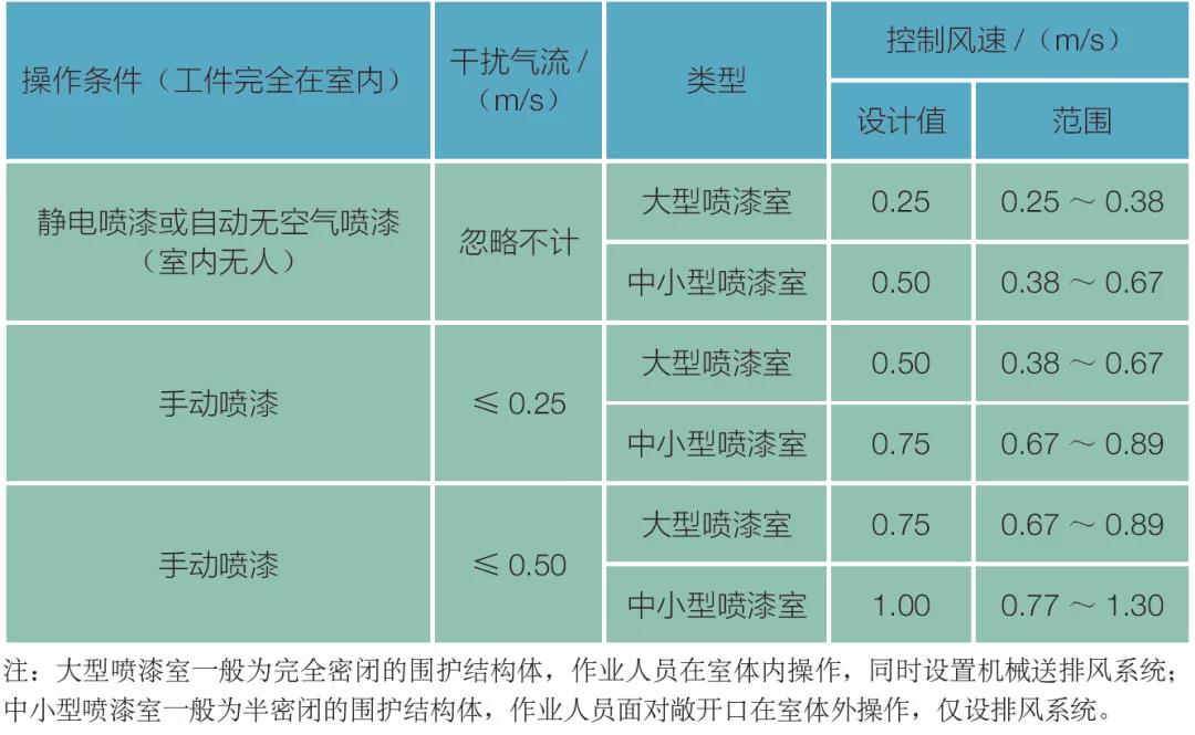 通用設(shè)備、機(jī)械制造行業(yè)(大型鋼構(gòu)、造船廠鋼構(gòu)/海工配件等)VOCs 排放主要在調(diào)漆、涂裝和干燥等工段,從車間功能來(lái)看,集中在噴漆房(包括底漆、面漆、清漆)、調(diào)漆房、干燥房。為減少無(wú)組織排放,最大限度的控制VOCs 排放量,需做好有機(jī)廢氣收集工作。那應(yīng)該怎么做,應(yīng)重點(diǎn)對(duì)照如下6點(diǎn) 1)使用溶劑型涂料的噴漆房、干燥車間應(yīng)嚴(yán)格密閉;對(duì)于流水線作業(yè)無(wú)法全封閉的情況,在進(jìn)出口等敞開位置需設(shè)置風(fēng)幕裝置;換氣風(fēng)量根據(jù)車間大小確定,保證VOCs 廢氣捕集率不低于95%; 2)對(duì)于只能采用吸風(fēng)罩收集的工序,排風(fēng)罩設(shè)計(jì)應(yīng)滿足《排風(fēng)罩的分類及技術(shù)條件》(GB/T 16758—2008)要求; 3)采用整體密閉的生產(chǎn)線,密閉區(qū)域內(nèi)換風(fēng)次數(shù)原則上不少于20次/ 小時(shí);對(duì)于整體密閉換風(fēng)的車間,車間換風(fēng)次數(shù)原則上不少于8 次/小時(shí);所有產(chǎn)生VOCs 的密閉空間應(yīng)保持微負(fù)壓; 4)噴漆室設(shè)計(jì)除滿足安全通風(fēng)外,任何濕式或干式噴漆室的控制風(fēng)速應(yīng)滿足《涂裝作業(yè)安全規(guī)程噴漆室安全技術(shù)規(guī)定》(GB 14444—2006)中下表的要求,如下表所示。當(dāng)然,一切的前提還要滿足GB-37822對(duì)控制點(diǎn)風(fēng)速的要求。