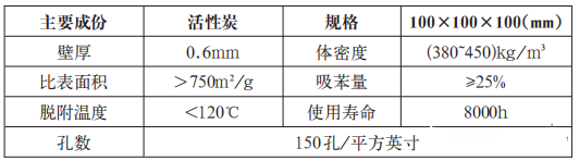 碳箱里面活性炭的選擇非常重要,因?yàn)橐磸?fù)經(jīng)過吸脫附,所以其質(zhì)量要比吸附即拋型活性炭要好,其使用時間可達(dá) 8000小時。應(yīng)選用以優(yōu)質(zhì)無煙煤作為原料、經(jīng)過高溫石墨化預(yù)制,外形蜂窩狀為宜。蜂窩活性炭具有空氣動力性能好,床層阻力小,吸脫附速度快,適合處理大風(fēng)量,低濃度有機(jī)廢氣。其規(guī)格參數(shù)表如下。