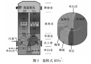 第三代 RTO 為旋轉(zhuǎn)式 RTO ( 見圖 3) ,與三床式 RTO 不同之處在于其旋轉(zhuǎn)切換閥在爐中形成多個等份分蓄熱室。其優(yōu)點是通過旋轉(zhuǎn)方向切換閥,有機廢氣被送到每個蓄熱室,加強了預熱效果,有利于氧化降解。
