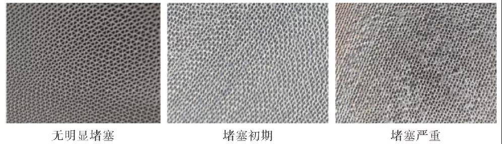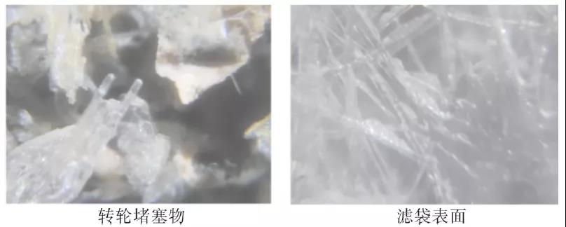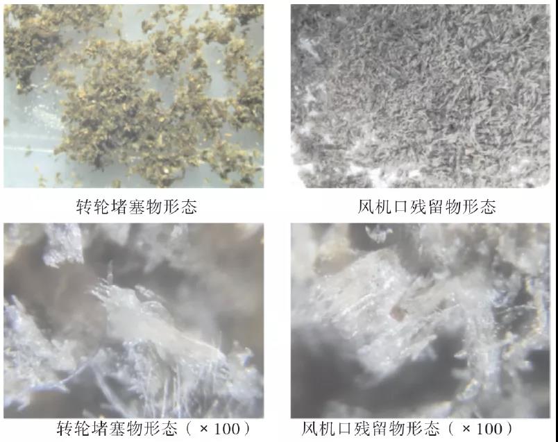 現(xiàn)場將轉(zhuǎn)輪鉆孔取樣,并將轉(zhuǎn)輪取樣切開,查看堵塞程度及堵塞物。堵塞物為絮狀顆粒物,微小、質(zhì)硬,不均勻地堵塞于轉(zhuǎn)輪入口前3 cm 內(nèi)的孔道內(nèi),不易疏通,后部基本無堵塞物,孔道貫通?,F(xiàn)場主要在轉(zhuǎn)輪孔隙和轉(zhuǎn)輪后風(fēng)機口發(fā)現(xiàn)堵塞物或殘留物,形態(tài)上轉(zhuǎn)輪堵塞物為顆粒狀,質(zhì)硬,風(fēng)機口殘留物為絮狀,質(zhì)軟。但在100 倍顯微鏡下,兩者形態(tài)基本一致,可見明顯長條狀物和類似樹脂的晶狀物。