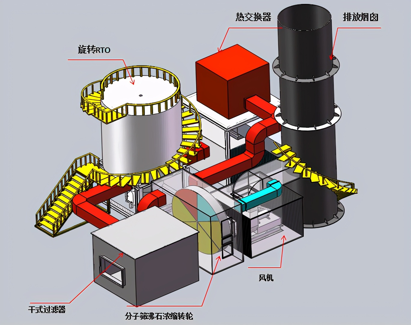 VOCs的種類十分繁多,成分復(fù)雜,治理的工藝也就多樣,很多情況下單單采取一樣凈化技術(shù)是很難的達(dá)到治理目的。 今天小編淺談沸石轉(zhuǎn)輪吸附+RTO催化燃燒治理工藝。 技術(shù)概況:采用沸石轉(zhuǎn)輪吸附濃縮法對(duì)低濃度、大風(fēng)量工業(yè)廢氣中的VOCs進(jìn)行濃縮,對(duì)濃縮后的高濃度、小風(fēng)量的污染空氣采用RTO蓄熱式氧化法進(jìn)行分解凈化。