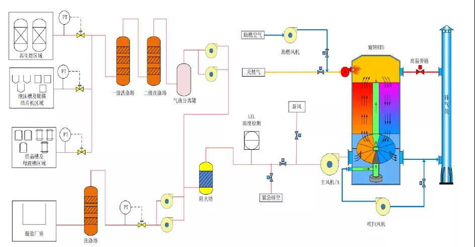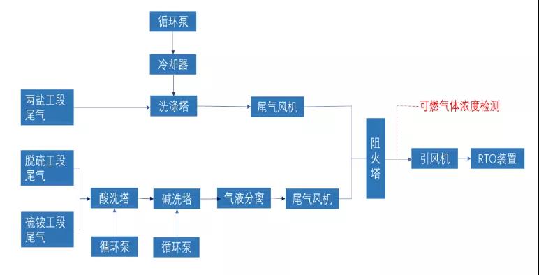 廢氣主要為凈化車間的脫硫、硫銨、提鹽工藝段的高氧廢氣,廢氣風量33000m³/h,提鹽工段廢氣中夾雜鹽顆粒及水蒸氣在收集端水洗冷凝塔中去除;脫硫、硫銨工段廢氣中含有的 NH3、H2S、硫酸氣等氣體在收集端酸、堿洗塔中前處理,然后氣液分離除濕后進入總管;兩股廢氣混合后通過阻火塔進入RTO焚燒蓄熱后達標排放。