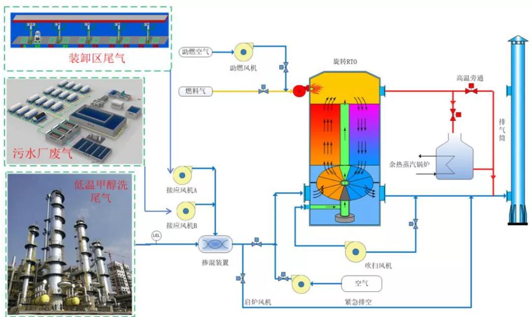 根據(jù)廢氣風(fēng)量及其攜帶的 VOCs 濃度,采用蓄熱式氧化焚燒法RTO是最可靠、最經(jīng)濟(jì)的治理工藝技術(shù)路線,《蓄熱氧化技術(shù)在低溫甲醇洗排放氣處理上的應(yīng)用》等文章中詳細(xì)描述了RTO技術(shù)在該領(lǐng)域的應(yīng)用,《煤制氣低溫甲醇洗VOCs廢氣處理技術(shù)探討》更是指出了旋轉(zhuǎn)式RTO較床式RTO在技術(shù)上有更高的可靠性和穩(wěn)定性。下面介紹兩個已投產(chǎn)的案例