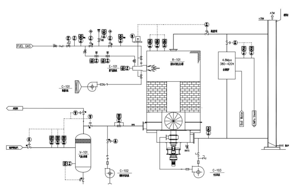 新疆廣匯新能源有限公司煤制液化氣采用 Lurgi氣化爐,低溫甲醇洗廢氣量為56000Nm³/h,可燃組分濃度約 4.6%,2019 年新疆廣匯新能源投運了一套 5.6 萬方/小時處理量的TO直燃爐設(shè)備,配套50T/h余熱鍋爐,用來治理低溫甲醇洗廢氣。項目總投資8000 萬,計劃每年的余熱利用效益1200萬。因為TO直燃爐適合于濃度 6%以上的廢氣,在低甲洗 VOCs 廢氣治理項目上使用能耗非常高,所以新疆廣匯低溫甲醇洗廢氣治理項目投運后,每小時需要伴燒 100—200Nm³/h天然氣,經(jīng)濟(jì)效益比預(yù)算大打折扣。