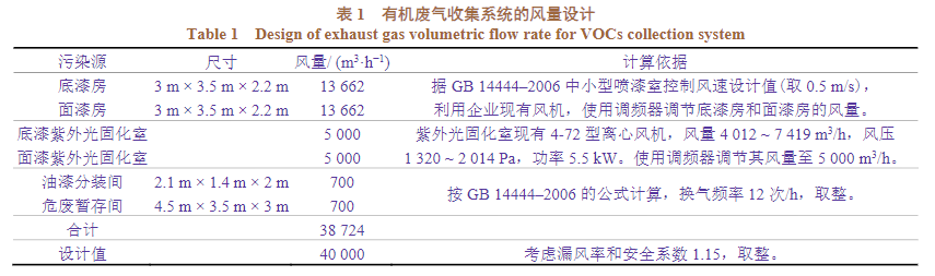 根據(jù)對(duì)VOCs產(chǎn)生源的分析,按表1進(jìn)行有機(jī)廢氣收集系統(tǒng)風(fēng)量計(jì)算。