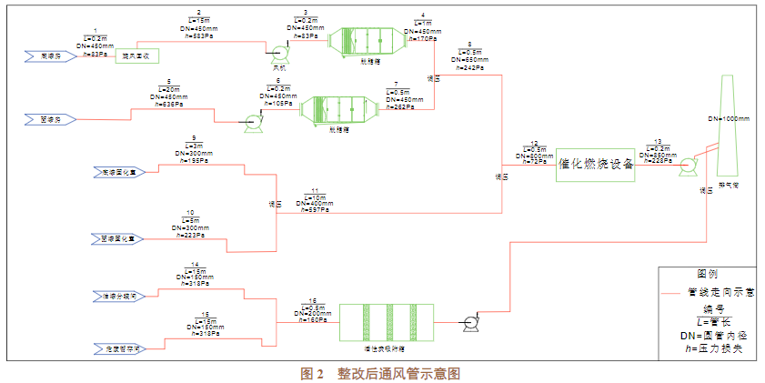 該企業(yè)現(xiàn)有的廢氣收集處理系統(tǒng)是自行設(shè)計(jì)的,矩形管和圓形管混接,管徑不適當(dāng),存在管線偏長(zhǎng)、管道壓力損失大、各并聯(lián)管網(wǎng)壓力損失不匹配、未設(shè)置調(diào)壓裝置等問(wèn)題,風(fēng)機(jī)風(fēng)壓不足以克服系統(tǒng)壓力損失,廢氣收集系統(tǒng)難以正常運(yùn)行,因此需要整改。