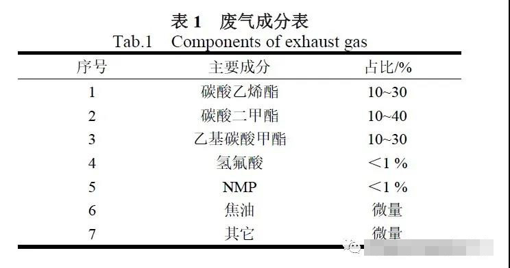 其中極板工程中攪拌制漿和涂布過(guò)程中會(huì)產(chǎn)生大量的NMP 廢氣,該部分廢氣的濃度相對(duì)高、風(fēng)量大、溶劑組分單一回收再利用價(jià)值較高,通常是采用轉(zhuǎn)輪回收+深度處理或者吸收塔回收+精餾+深度處理的處理工藝,這一部分的廢氣治理技術(shù)比較成熟。其中的難點(diǎn)在于組裝過(guò)程和化成過(guò)程中注液和真空干燥產(chǎn)生的VOCs 廢氣,該部分的廢氣風(fēng)量相對(duì)小、濃度波動(dòng)大而且含有焦油,這一部分廢氣之前不是未被識(shí)別就是采用活性炭或者堿洗等簡(jiǎn)易的處理工藝,不僅維護(hù)操作繁瑣而且容易排放超標(biāo)。 烘干和注液廢氣的來(lái)源主要就是電解液,電解液是由電解質(zhì)鹽和稀釋劑組成,為無(wú)色液體,其中主要組分為六氟磷酸鋰(10 %~30 %)、碳酸乙烯酯(0 %~30 %)、碳酸二甲酯(0 %~30 %)、乙基碳酸甲酯(0 %~30 %),其中六氟磷酸鋰容易發(fā)生水解產(chǎn)生氫氟酸,此外由于前端生產(chǎn)工藝中使用了NMP 后端廢氣中也含有少量的NMP。烘干和注液廢氣的主要成分見(jiàn)下表: