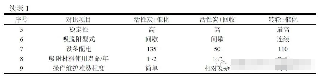 從上表可知,采用轉(zhuǎn)輪+催化燃燒的處理方式投資和運(yùn)行費(fèi)用相對(duì)來(lái)說(shuō)都比較高、此外由于廢氣中含有酸性及高沸點(diǎn)氣體可能會(huì)導(dǎo)致轉(zhuǎn)輪的使用壽命降低,但是具有去除效率高、排口穩(wěn)定達(dá)標(biāo)、占地小、操作維護(hù)簡(jiǎn)單等優(yōu)點(diǎn),對(duì)活性炭+催化燃燒工藝來(lái)說(shuō)投資費(fèi)用及運(yùn)行費(fèi)用相對(duì)較低,但是也存在蜂窩活性炭需要定期更換、排口濃度不穩(wěn)定、設(shè)備配電功率大等缺點(diǎn);對(duì)活性炭+冷凝回收工藝來(lái)說(shuō)投入相對(duì)較高但運(yùn)行費(fèi)用低、設(shè)備配電功率小,但是也存在著排口排放濃度不穩(wěn)定、活性炭需要定期更換、冷凝下來(lái)的有機(jī)物只能作為廢液等缺點(diǎn)而且需要額外供應(yīng)蒸汽和冷卻水。