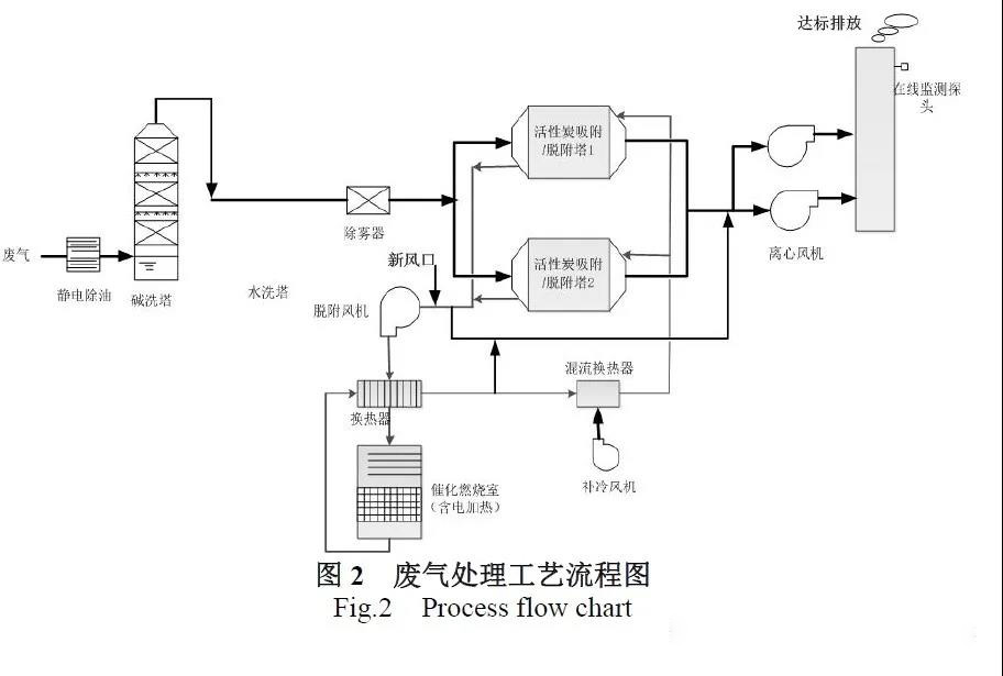 廢氣處理系統(tǒng)的運(yùn)行過(guò)程如下:首先廢氣通過(guò)靜電除油去除廢氣中的焦油等物質(zhì),然后經(jīng)過(guò)堿洗來(lái)去除廢氣中的氟化氫以及其它的酸性組分,經(jīng)過(guò)堿洗除霧之后(雖然設(shè)置了兩級(jí)除霧系統(tǒng)但是廢氣的濕度還是比較大專(zhuān)門(mén)增加了一套除濕的設(shè)備),經(jīng)過(guò)進(jìn)一步除濕后進(jìn)入活性炭箱進(jìn)行吸附后排放,吸附飽和的炭箱通過(guò)閥門(mén)切換進(jìn)入到脫附系統(tǒng),通過(guò)熱風(fēng)不斷的將活性炭中有機(jī)廢氣脫附出來(lái)并送入催化燃燒系統(tǒng)中進(jìn)行焚燒處理,脫附完成后進(jìn)行冷卻吹掃,吹掃完成后進(jìn)入到備用狀態(tài),通過(guò)吸附、脫附閥門(mén)的開(kāi)關(guān)可使得活性炭箱在吸附、脫附等狀態(tài)不斷切換,此外可根據(jù)排口濃度檢測(cè)的檢測(cè)數(shù)據(jù)實(shí)現(xiàn)自動(dòng)切換活性炭箱的吸脫附。該項(xiàng)目出口NMHC 的排放濃度穩(wěn)定在在50 mg/m3 以下。