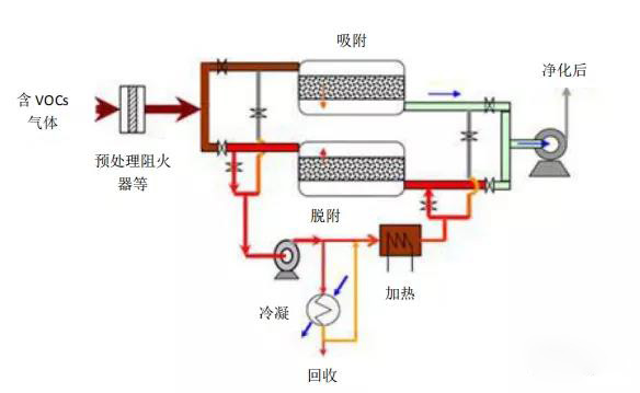 整個(gè)系統(tǒng)由來氣預(yù)處理、吸附、循環(huán)加熱脫附、冷凝回收和自動(dòng)控制等主要部分構(gòu)成。含VOCs的氣體通過預(yù)處理后進(jìn)入吸附段吸附后達(dá)標(biāo)排放,吸附段通常并聯(lián)設(shè)置有吸附罐并通過切換閥控制實(shí)現(xiàn)氣體的連續(xù)吸附操作。吸附到設(shè)定程度的吸附罐通過切換閥切換形成再生循環(huán)回路。循環(huán)回路可通過充入惰性氣體置換系統(tǒng)內(nèi)氣體的方式減少氣相中的含氧量,從而減少再生過程中某些類型溶劑的氧化副產(chǎn)物的生成。通過循環(huán)風(fēng)機(jī)和加熱器可形成循環(huán)氣流加熱吸附罐進(jìn)行脫附,同時(shí)通過分流冷凝系統(tǒng)冷凝回收溶劑。